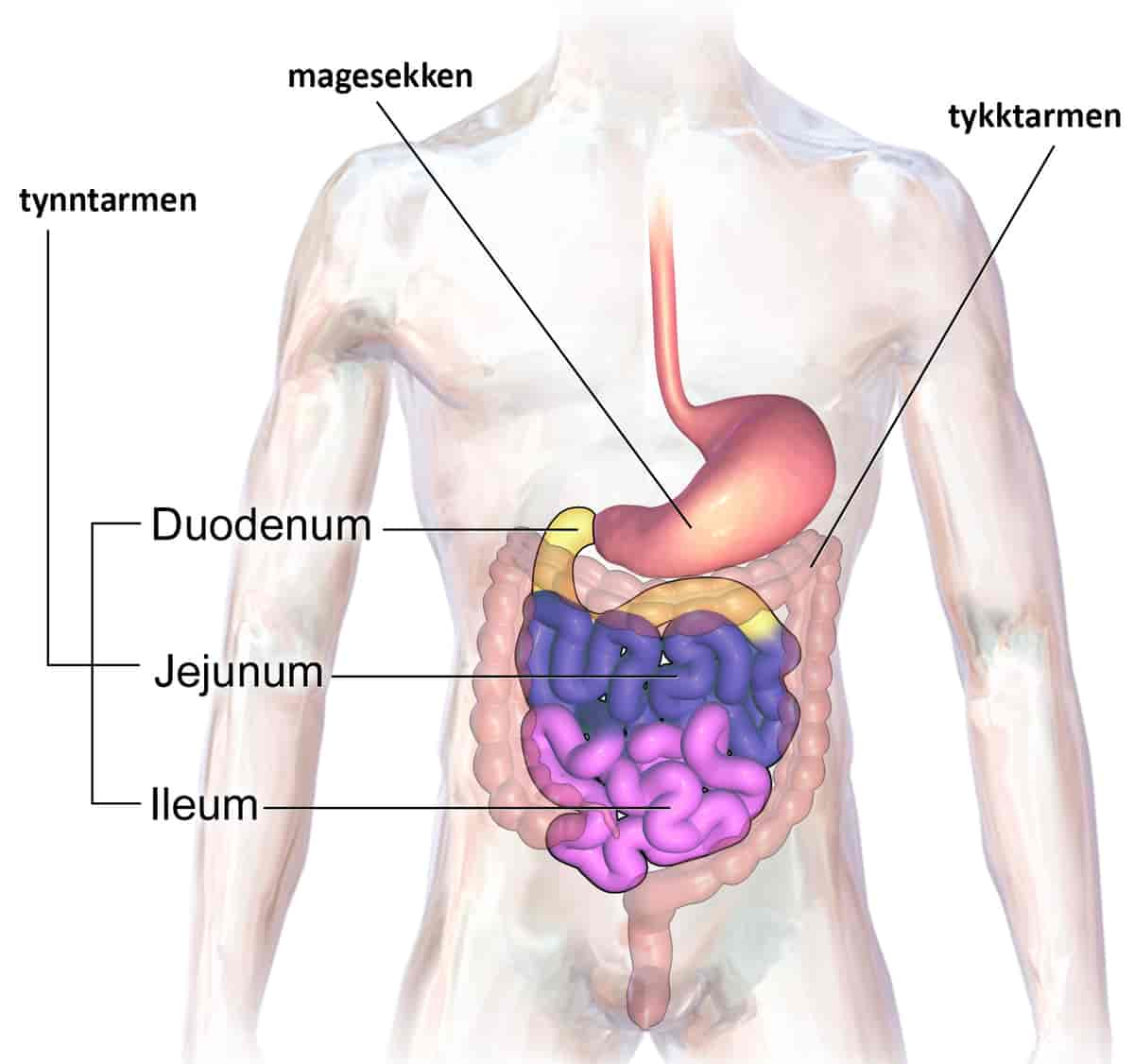 umiddelbart etter magesekken. Den er 4–5 meter lang og går